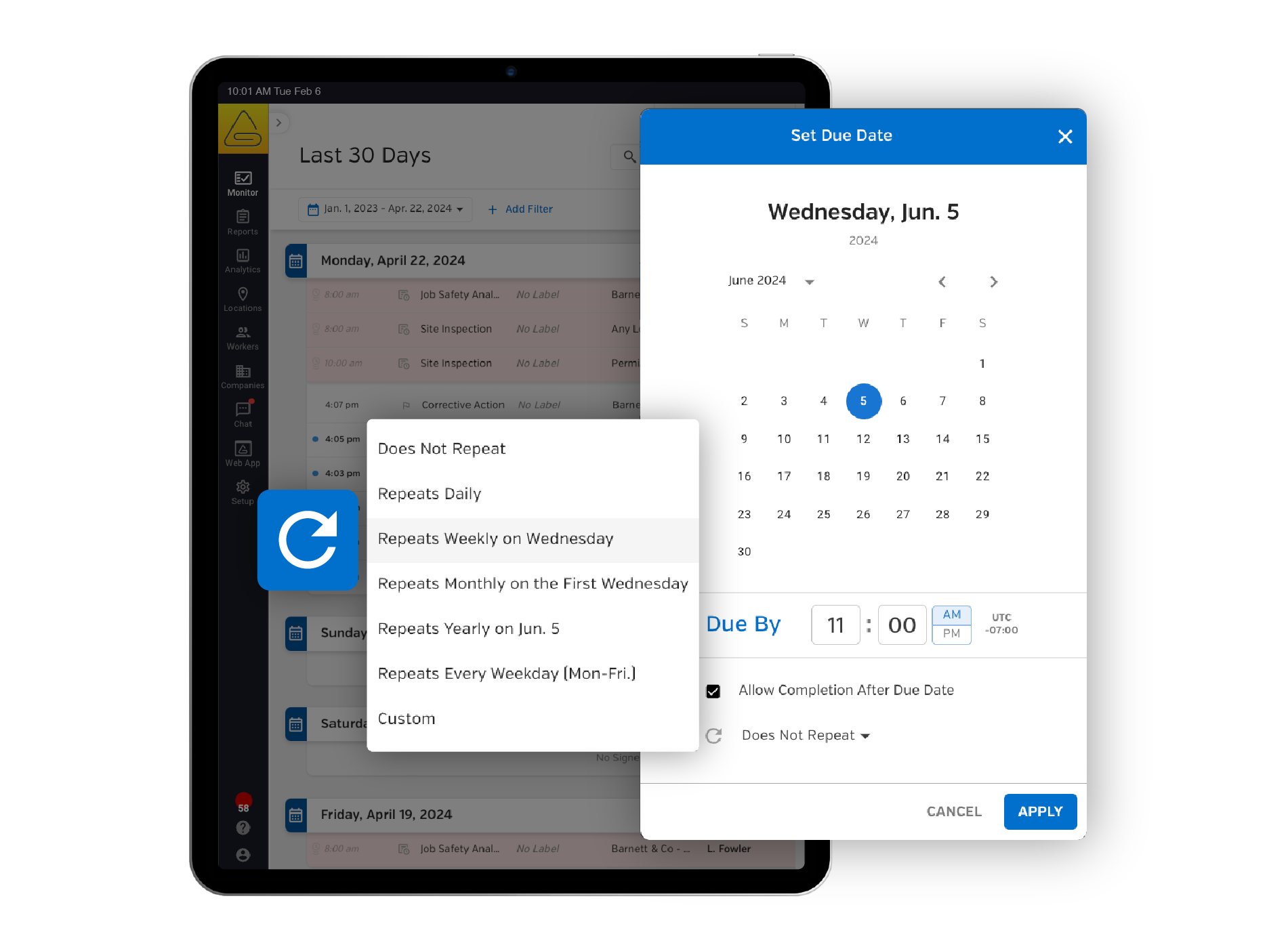 Schedule forms, toolbox talks, hazard inspections, and more by date and set them to automatically repeat, so you only need to schedule them once, reducing your administrative workload.